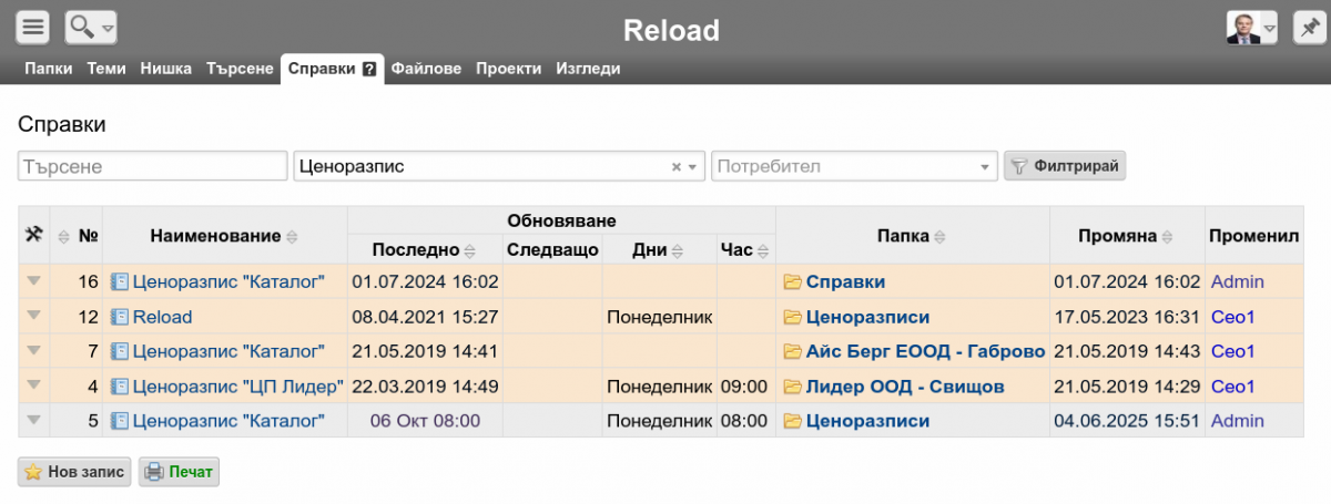 Справки съдържа списък на всички справки създадени в системата, независимо в коя папка се намират и от кого са създадени. Видим и достъпен е за поребители с роля