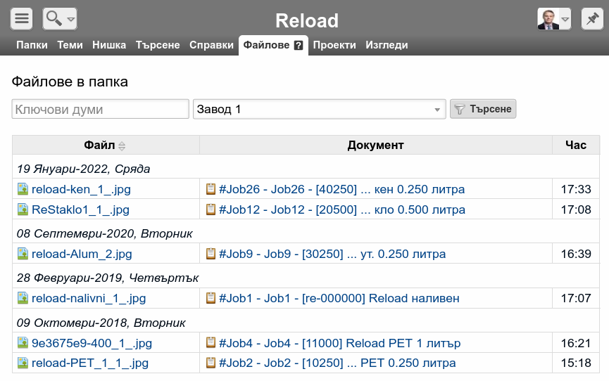 Файлове съдържа списък на всички добавени към документи файлове и указва документа в който са включени. Добавен е филтър за избор на папка: