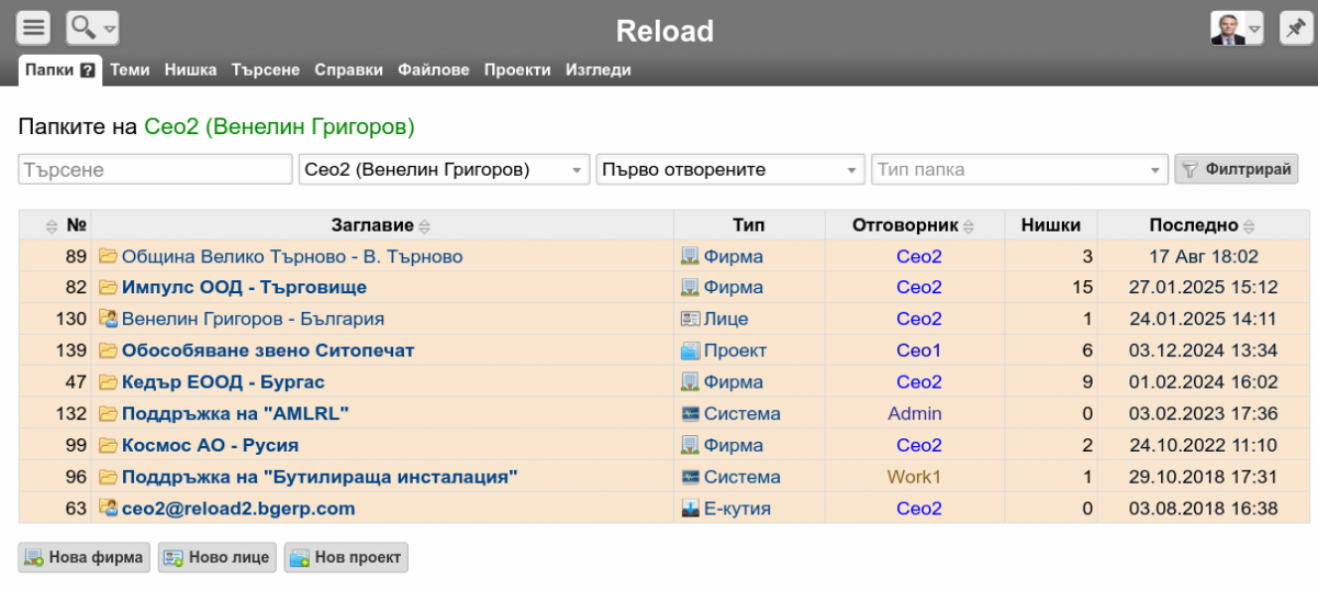 Папки. Тя съдържа списък с всички папки, до които текущият потребител има достъп. В общия случай това са собствените му папки (тези на които е отговорник) и тези, които са му споделени: