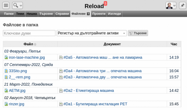 Файлове съдържа списък на всички добавени към документи файлове и указва документа в който са включени. Добавен е филтър за избор на папка: