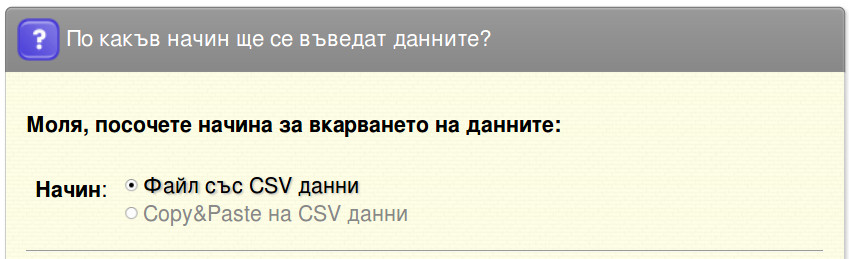 Общото във формите е изборът на разделител, ограждане и тип на информацията в първия ред. Когато данните се въвеждат с копиране и поставяне техен източник може да е всеки текстов файл (.TXT, .DOC, .XLS и т.н.) където те са въведени в CSV формат (Comma Separated Values – стойности, разделени със запетаи).