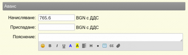 В bgERP e предвидена и възможността за отразяване в сделката на издадените от доставчика фактури за платените авансово средства. Когато сме избрали метод на плащане, при който част от сумата се заплаща авансово, във формата за въвеждане на входяща фактура в секция Аванс, в поле Начисляване е подсказана сумата на авансa:Полетата за сума са свободни за редакция. Записва се в Чернова и се активира:
