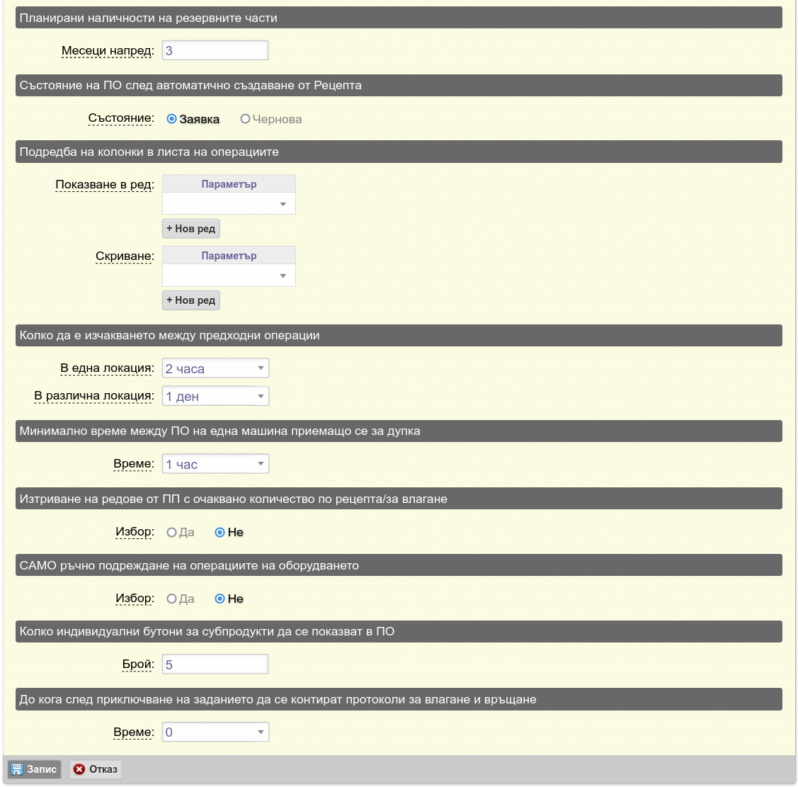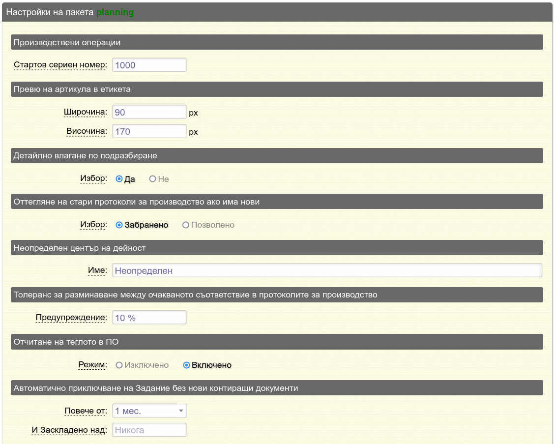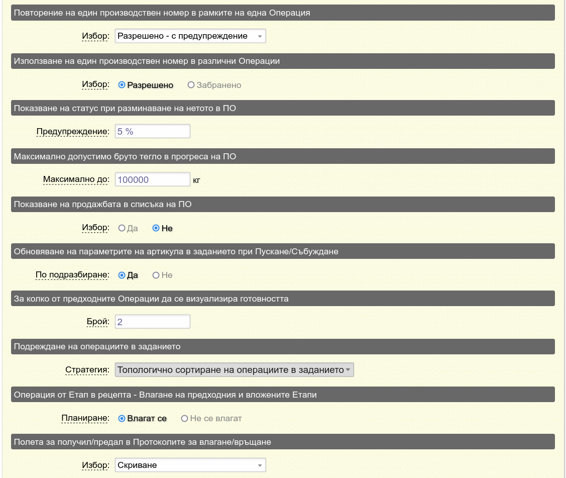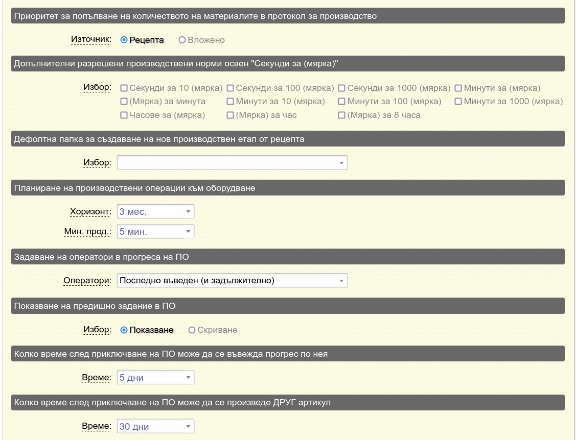 От този пакет могат да се зададат стойности, за някои от елементите на производствения процес - от какъв номер да започват производствените операции, детайлно ли ще е влагането на материали, ще се отчита ли теглото в производствените операци, след колко време и при какво изпълнено количесто автоматично да се закриват заданията за производство към затворени артикули, допълнителни разрешени мярки за производствени норми, добавяне на протоколи за влвгане и връщане в приключени задания и др.