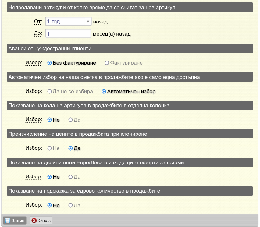 Тук са включени настройки, които се отнасят към създаването и извършването на сделки за продажба. Указва използването на фискален принтер, посочват се шаблони по подразбиране за договорите за продажба и др.