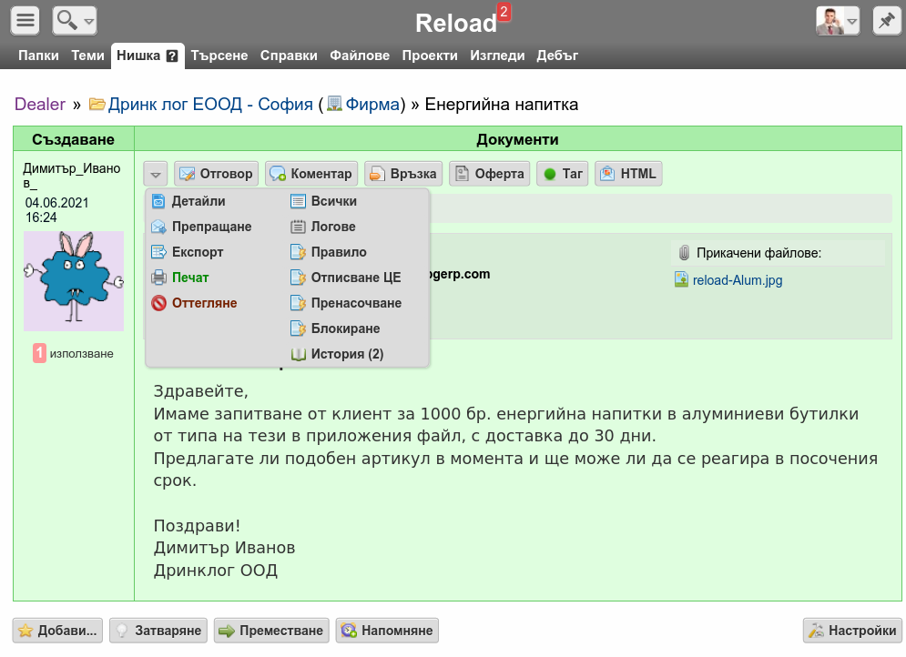 Клик върху прикачен файл го отваря за преглед в системата. Отново на разположение е ред от минитабове за извличане на подробна информация за файла. Бутон Сваляне служи за локално изтегляне на файла. Бутон Pixlr зарежда файла в графичен редактор, а ако имаме инсталиран софтуер за оптично разпознаване на текст с бутон OCR може да се извлича текст от прикачения файл: