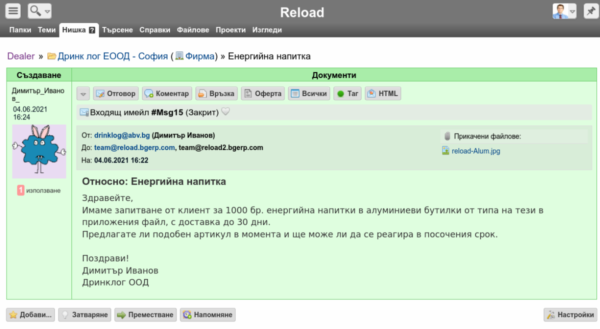 - когато писмото е получено като отговор на друго - във вече съществуваща нишка, в която потребителят е създал какъвто и да е документ - известието е от вида: "@system добави входящ имейл в "Заглавие_на_нишката"", а клик върху нея зарежда нишката, в която е разпределено писмото; ако нишката е по-дълга - т.е. в нея има повече документи, то самото писмо е на фокус и в първите няколко секунди е осветено в жълт цвят.