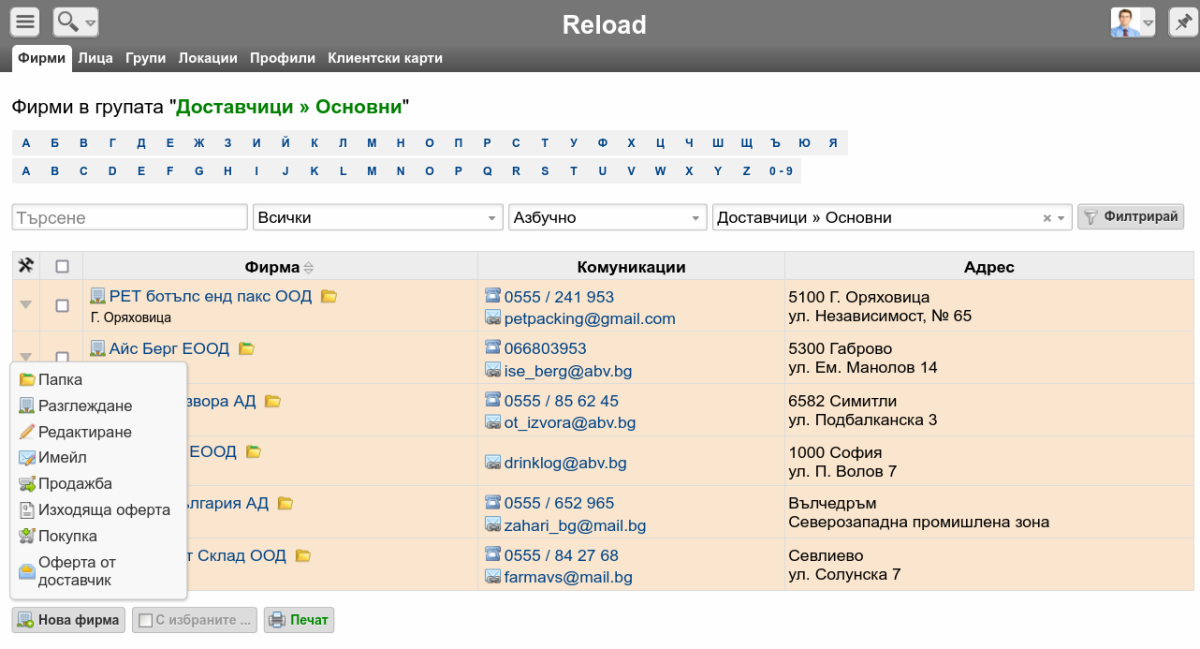 От списъка, с клик върху името на фирма може да се зареди нейната визитка. От бутона пред името на фирмата в списъка са възможни зареждането на формата за редактиране и отварянето на папката на контрагента. Изведени са и бързи бутони за създаване на документи: