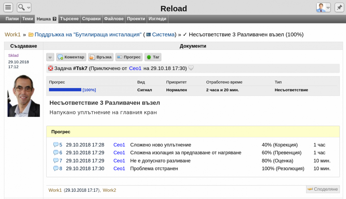 От бутон Прогрес в изгледа на активирана задача-сигнал се добавят в нея предприетите действия за решаване на проблема:- Корекция - описват се взетите за отстраняване на проблема мерки и резултатът от тях;